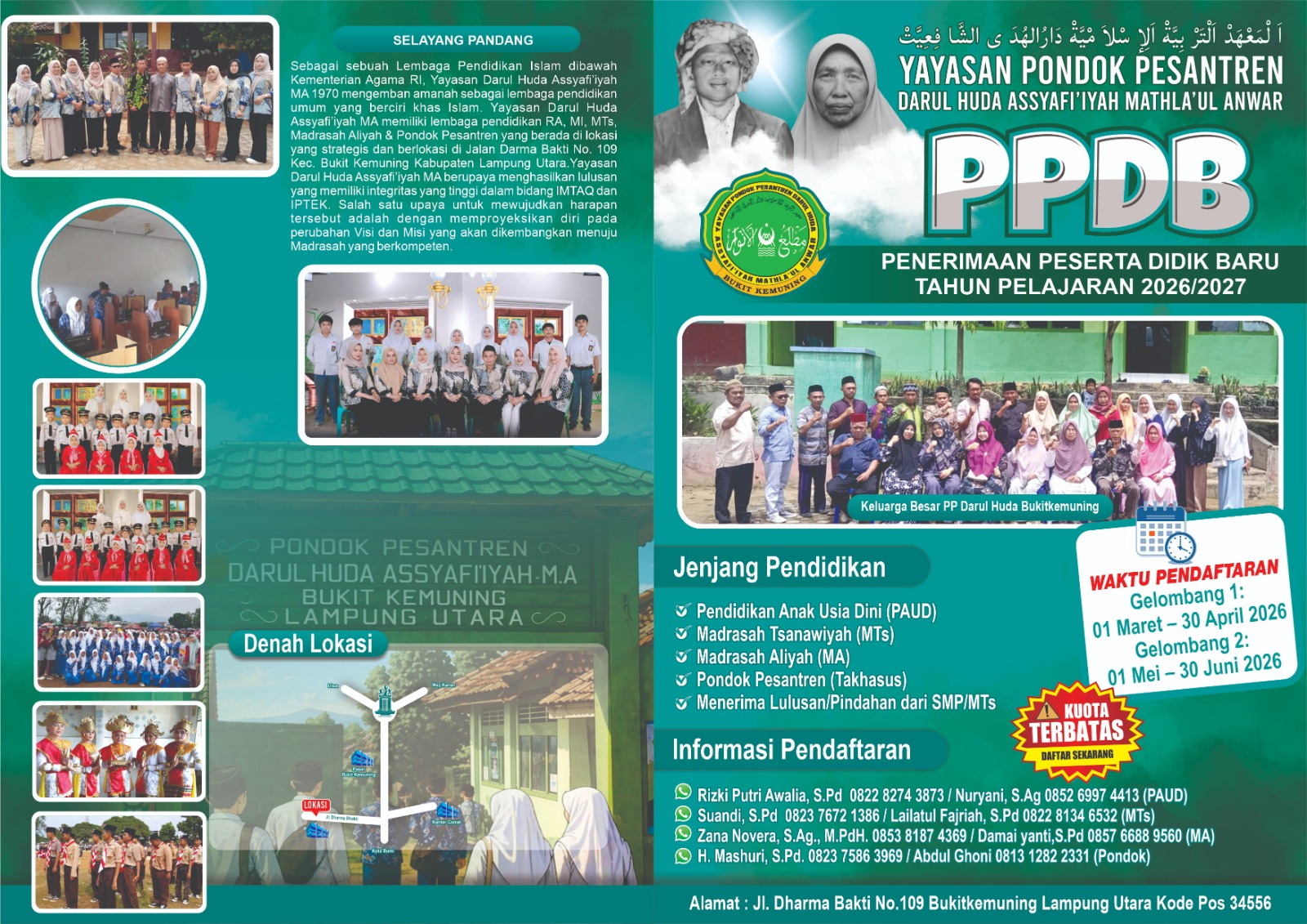 Pondok Pesantren Daarul Huda As-Syafi’iyah Matla’ul Anwar yang berlokasi di Desa Kaduronyok, Jalan Darma Bakti No. 109, Kecamatan Bukit Kemuning, Kabupaten Lampung Utara, resmi membuka Penerimaan Peserta Didik Baru (PPDB) Tahun Pelajaran 2026/2027.